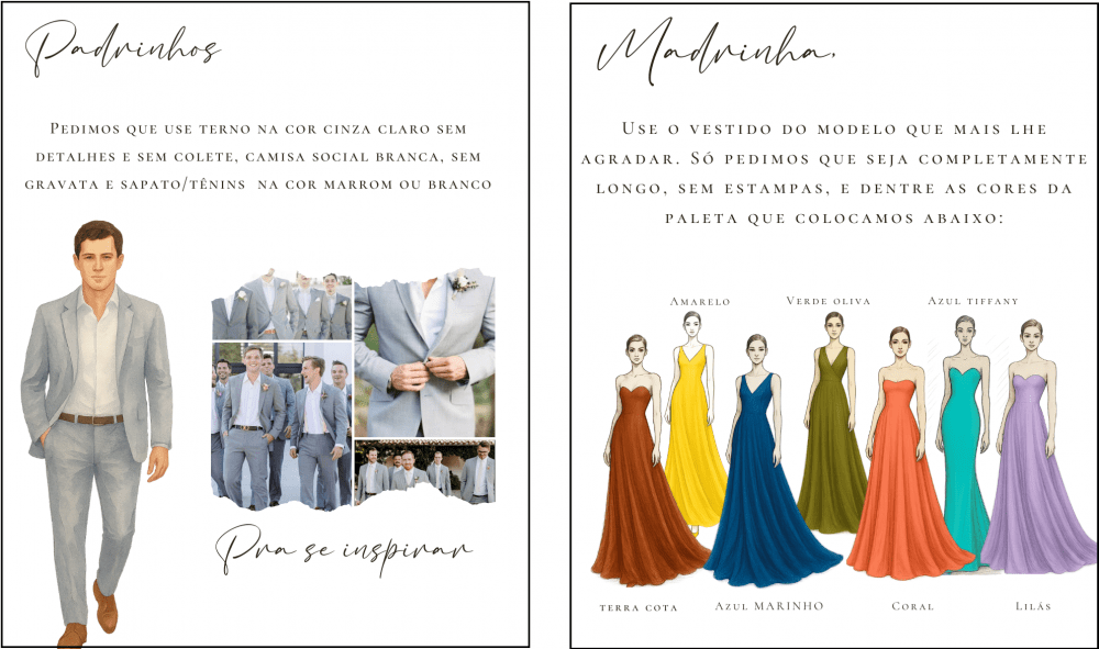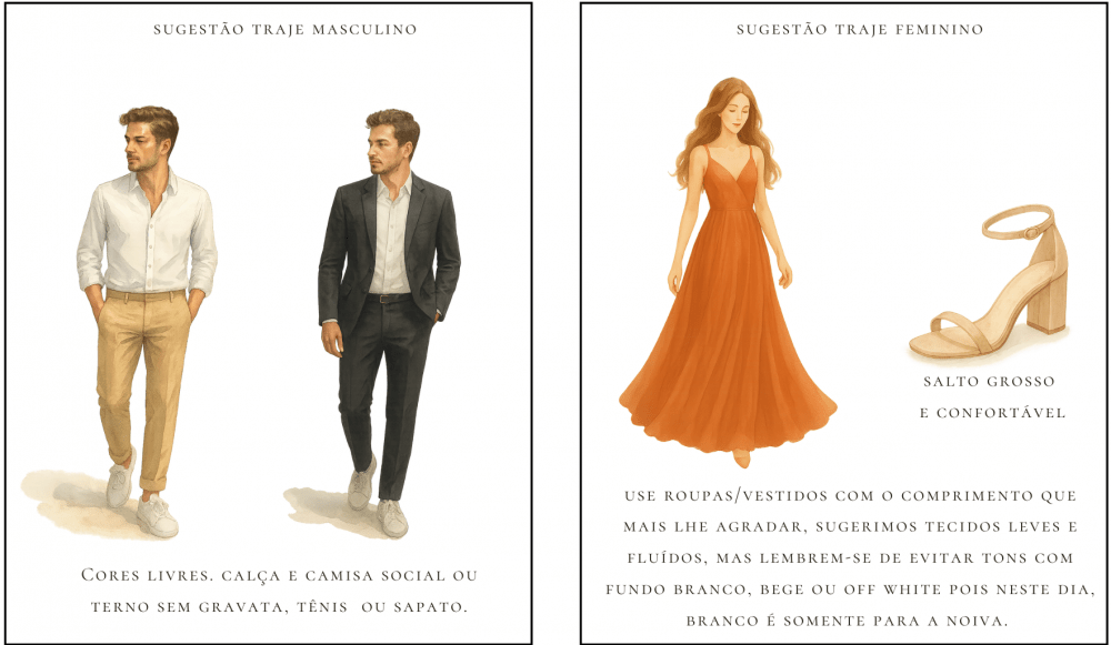 Pedimos que utilizem Traje esporte fino. Mulheres, lembrem-se de levar um agasalho pois o local é rodeado de vegetação e lagos, podendo ficar mais fresco durante a noite/madrugada.